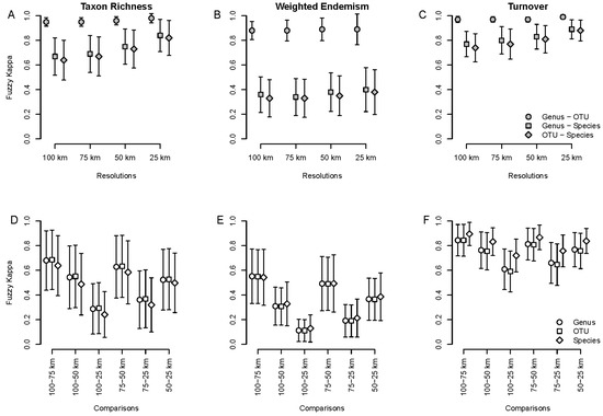 Average spatial agreement measured with the fuzzy Kappa index for taxon richness, weighted endemism and taxon turnover, based on specimen data. (A–C): comparisons between taxonomic levels (species, genus and OTU) at different spatial resolutions (100, 75, 50 and 25 km grid cells). (D–F): comparisons within taxonomic levels and between spatial resolutions.