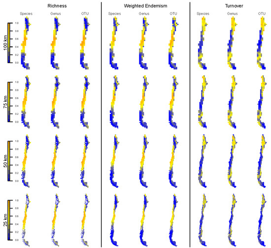 Spatial distribution of SDM-based biodiversity indices (taxon richness, weighted endemism and turnover) at different taxonomic levels (species, genus and OTU) and spatial resolutions (100, 75, 50 and 25 km grid cells). All biodiversity indices were transformed to percentages to obtain a comparable, common scale across indices. The spatial distribution depicted maps the geographic boundaries of Chile.