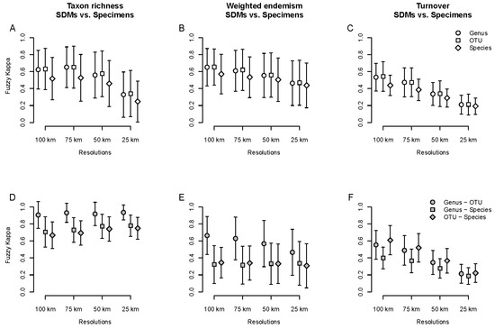Average spatial agreement measured with the fuzzy Kappa index for taxon richness (A,D), weighted endemism (B,E) and turnover (C,F) between specimen-based and SDM-based analyses. (A–C): comparison within taxonomic levels, for different spatial resolutions. (D–F): Comparison between taxonomic scales for different spatial resolutions.
