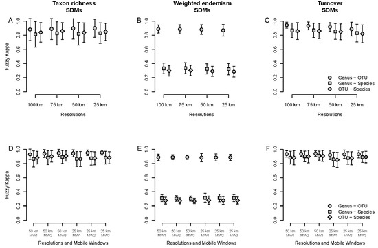 Average spatial agreement measured with the fuzzy Kappa index for taxon richness (A,D), weighted endemism (B,E) and turnover (C,F) using species distribution models (SDMs). (A–C): Comparison between taxonomic levels (species, genus and OTU) for different spatial resolutions (100, 75, 50 and 25 km grid cells). (D–F): Comparison between taxonomic scales for different spatial resolutions (50 and 25 km grid cells) and mobile windows (MW1, MW2 and MW3).