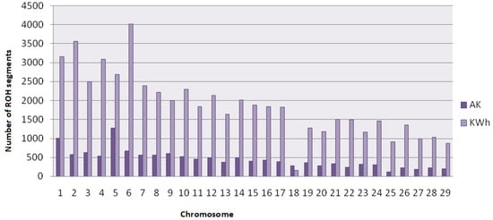 In the population examined, the total length of the autosomal genome was equal to 2.34 Gb. The highest number of ROH was recorded for chromosomes 5 (1281) and 6 (4019), while the lowest number of ROH was observed for chromosomes 25 (124) and 18 (163) in the Auliekol and Kazakh white-headed breeds, respectively (Figure 1). The first 6 out of 29 chromosomes had a superior percentage of ROH in both breeds (Figure S1). Furthermore, the mean length of runs per chromosome was calculated, varying between 4.48 and 2.53 per chromosome.