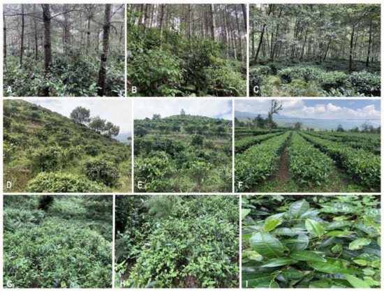 Tea plantations in Yunnan Province. (A–C) = Shade tea. (D–F) = Terraced tea. (G–I) = Mix planting.