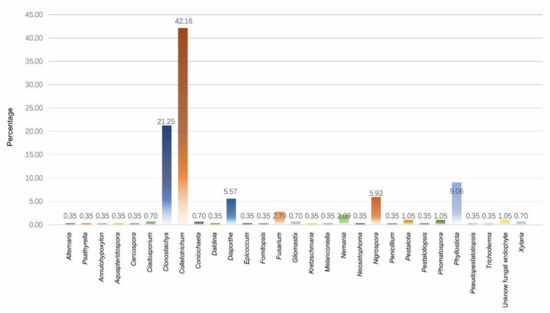 The 287 fungal endophytes isolated from 11 tea plantations in Yunnan Province, China, were successfully identified at the genus level. The results indicate a high diversity of endophytic fungi with consisting of 28 genera, the majority belonging to Sordariomycetes in the phylum Ascomycota with Colletotrichum (related to C. gloeosporioides species complex) and Clonostachys (related to Clonostachys rosea) being the most dominant (Figure 3).