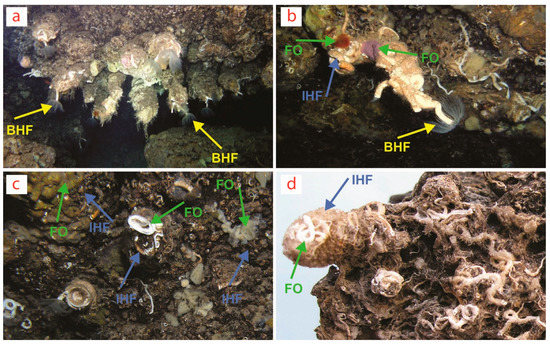 Biostalactites built by the serpulid polychaete Protula tubularia (Montagu, 1803) in marine caves of (a) Crete and (b,c) Lesvos Island in the Aegean Sea (Greece, Eastern Mediterranean) and (d) Sicily (Plemmirio Marine Protected Area, Ionian Sea, Italy, Central Mediterranean). Yellow arrows point to the basal habitat former (BHF) P. tubularia constituting the core of the biostalactites, usually better visible at their tips. Blue arrows point to the intermediate habitat formers (IHF) (i.e., mostly other serpulids and encrusting bryozoans). Green arrows point to focal organisms (FO) (i.e., mostly sponges and also some serpulids and bryozoans). Further endolithic FO (i.e., boring bivalves, sponges, brachiopods, foraminiferans and heterotrophic bacterial communities) are not visible. BHF are not visible in (c,d) because they are completely covered by IHF and FO. Photos by V. Gerovasileiou (a–c) and A. Rosso (d).