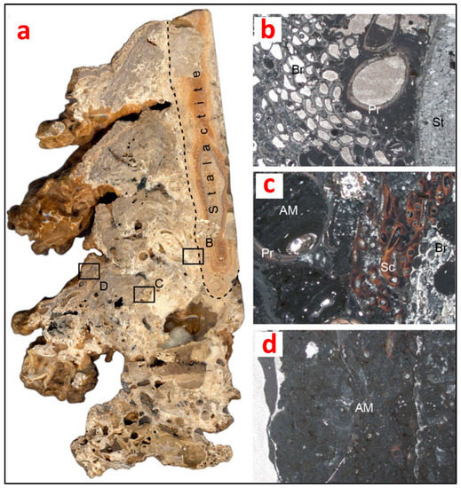(a) Polished longitudinal section of a biostalactite from the Mazzere cave (Plemmirio Marine Protected Area, Sicily, Italy). Note the internal framework of the bioconstruction formed of skeletons mixed with fine autochthonous micrite derived from microbial metabolic activity (rectangles represent the location of the microfacies showed in b, c and d); (b) inner part of the bioconstruction formed by skeletons of the serpulid Protula tubularia, acting as basal habitat former, encrusted by bryozoans, here acting as intermediate habitat formers; (c) intermediate part of the bioconstruction showing the superimposition of skeletons of encrusting organisms (intermediate habitat formers) and the microbial-derived autochthonous micrite-filling microcavities (bacteria act in this part of the bioconstruction as focal organisms); (d) near-surface part of the bioconstruction forming the substrate for a new generation of epifaunal communities. It is mainly composed of microbial-derived autochthonous micrite (bacteria act in this part of the bioconstruction as basal habitat formers). St: stalactite; Pr: Protula tubularia; Br: bryozoan colony; Sc: Semivermilia crenata (O.G. Costa, 1861); AM: autochthonous micrite. Photos by A. Guido.