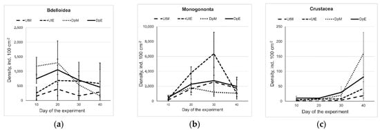 Density dynamics (ind. 100 cm−2) of epizoic rotifers, i.e., Bdelloidea (a) and Monogononta (b), and microcrustaceans (c) on D. polymorpha and U. tumidus in the mesotrophic and eutrophic experimental conditions (Experimental treatment abbreviations: UtM—Unio tumidus with mesotrophic water source, UtE—U. tumidus with eutrophic water source, DpM—Dreissena polymorpha with mesotrophic source, DpE—D. polymorpha with eutrophic water source.