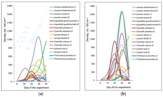 Abundance dynamics (ind. 100 cm−2) of the most abundant rotifer species in the mesotrophic (a) and eutrophic (b) experimental conditions. Abbreviations after species names: U—Unio tumidus, D—Dreissena polymorpha.