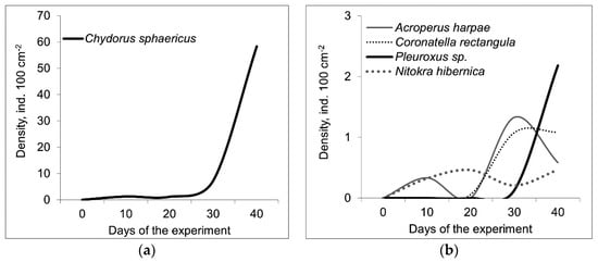 Abundances of different taxa in the experiment reached peaks in accordance with the hatching process described by Kalinowska et al. []. In their experiment, species forming resting cysts such as bdelloid rotifers hatched after the first day of their incubation whereas hatching from resting eggs (monogonont rotifers and crustaceans) occurred from the 2nd to 3rd day. Similarly to our experiment, abundance of the three groups of invertebrates first gradually increased and then sharply decreased. Rotifer species reached maximum abundance on the 23rd day, cladocerans attained peak on the 21st day and copepods—on the 33rd day [].
