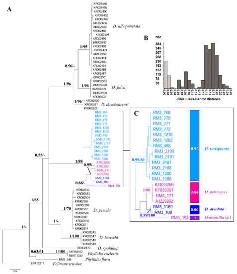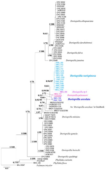 The concatenated and partitioned (ConcDNA) dataset consisted of 79 sequences with a bp length of 1315 obtained from 74 specimens belonging to Doriopsilla, three belonging to Phyllidia, and the outgroup Felimare tricolor (Figure 2).