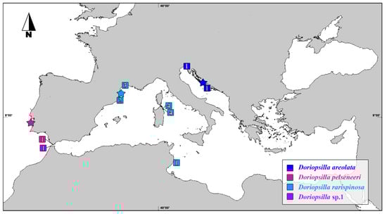 The genus Doriopsilla groups 24 accepted taxa, with D. areolata as the type species []. The distribution range of the different species included in the mentioned genus spans almost worldwide [,], as they occur in the shallow coastal waters of the Pacific coast of North America, Australia, Indo-Pacific, Persian Gulf, South and West Africa, Mediterranean Sea, European Eastern Atlantic, North American Western Atlantic, and Caribbean Sea [,,,]. To date, three species are reported in the Mediterranean Sea: Doriopsilla areolata Bergh, 1880 [,]; D. evanae Ballesteros and Ortea, 1980 []; and D. pelseneeri d’Oliveira, 1895 [] as Dendrodoris minima [,,,,,,]. Some authors [] hypothesized D. evanae as a possible synonym of D. areolata; however, they are currently regarded as distinct valid species. Other synonymized names are known for D. areolata, including D. fedalae Pruvot-Fol, 1953; D. pusilla Pruvot-Fol, 1951; D. rarispinosa Pruvot-Fol, 1951; and Doris reticulata Schulz in Philippi, 1836: The latter is considered as invalid, being the junior homonym of Doris reticulata Quoy & Gaimard, 1832 []. A possibility that D. areolata hides a complex of cryptic species has also been suggested [,].
