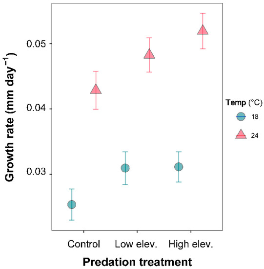 Larvae grew faster in water at 24 °C than at 18 °C (LME: p = 0.0001; Table S1). Growth rate was significantly different among predation treatments (LME: p = 0.002; Table S1), revealing a faster growth in predation treatment compared to the control treatment (Figure 2). The significant interaction between time and temperature and the non-significant three-way interaction between time, temperature, and predation indicate that larvae responded similarly to the different predators at both temperatures (p > 0.05; Table S1).