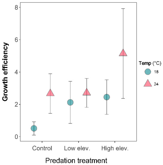 Growth efficiency was significantly different between temperature (LME: p = 0.0002) and predator treatments (LME: p < 0.002) (Figure 3). Growth efficiency was 81.6% greater at higher temperature than at lower temperature. Larvae in predation treatments showed a higher growth efficiency than in the control treatment, but there was no significant difference between low and high-elevation predator (Figure 3). There was a small significant interaction between temperature and predation treatment (Table S2).