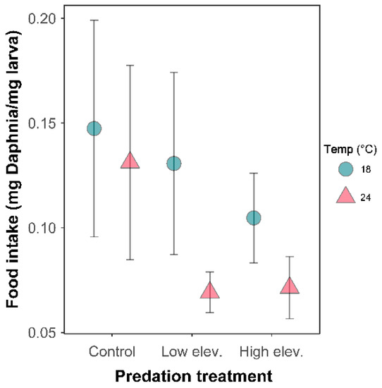 There was a significant interaction between temperature and predation (Figure 4, Table S3). At 18 °C, larvae showed a lower food intake in high-elevation predator treatment (p = 0.002). At 24 °C, larval food intake was lower in both low- and high-elevation predator treatment than in the control, although marginal for the high-elevation predator (Table S3, p = 0.01; p = 0.07, respectively).