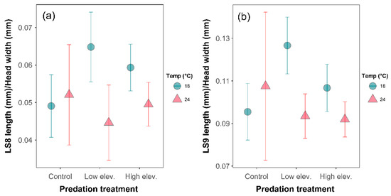 The length of the 8th lateral spine was longer in the low-elevation dragonfly treatment (p = 0.01; Table S4a, Figure 5a), but neither temperature nor the interaction of temperature with predation showed a significant effect (Table S4a). The length of the 8th lateral spine was 32% longer in the low-elevation predator treatment than in the control (Figure 5a, Table S4a). Similar to the 8th lateral spine, there was no significant effect of temperature on the length of the 9th lateral spine (Table S4b, p = 0.64). However, larvae in the low-elevation dragonfly treatment under 18 °C had significantly longer 9th spines than the other treatments (p = 0.001; Table S4b, Figure 5b). The average length of the 9th spine in the low-elevation predator treatment was 33% longer than that of the control.