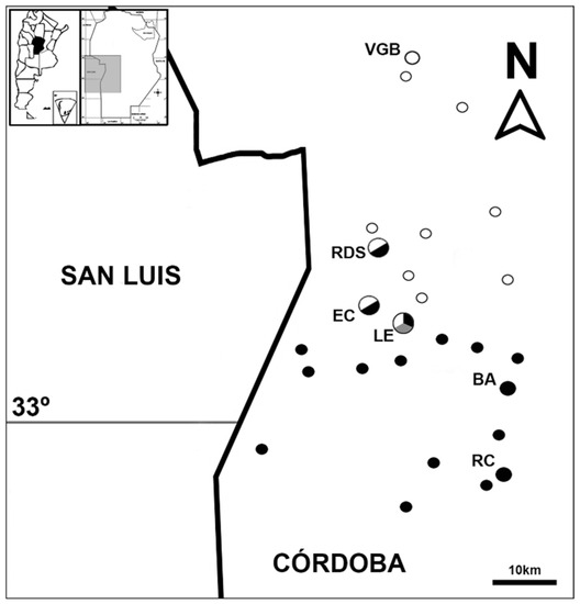 Map of the study localities. White dots indicate localities with exclusively O. cordobae, black dots localities with exclusively O. americanus, dots with 2–3 three color codes mixed assemblages (gray color indicates the presence of triploids). VGB = Villa General Belgrano, RDS = Rio de los Sauces, EC = El Cano, LE = La Escondida, BA = Coronel Baigorria, RC = Rio Cuarto. The broad line marks the western border between the provinces of Cordoba and St. Luis. Inserts give the location of the study site within Argentina.