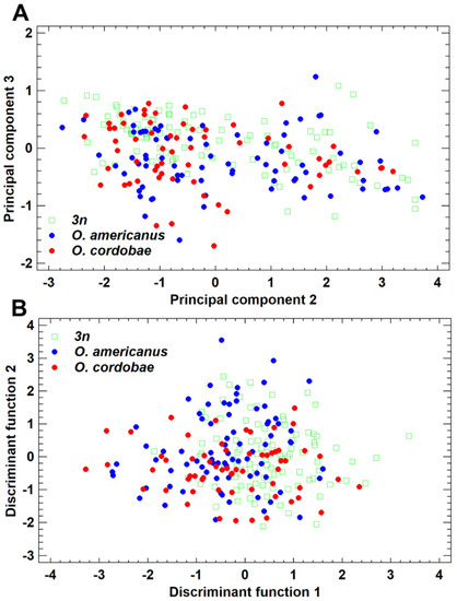 Discriminant analysis of the same data set yielded a single marginally significant discriminant function (eigenvalue = 0.17, canonical correlation = 0.3783, Χ² = 45.7, df = 30, p = 0.0329; Figure 2B). The second function did not contribute significantly to group separation function (eigenvalue = 0.05, canonical correlation = 0.2144, Χ² = 10.7, df = 14, p = 0.7112). The rate of correct classification was low in all taxa: 40.3% in O. cordobae, 41.6% in O. americanus, and 56.1% in the triploids. The misidentified specimens were equally distributed over the other two taxa. The three syntopic Odontophrynus taxa were indistinguishable using size- and shape-related morphometric characters.
