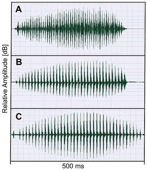 Stereo recordings were converted to mono at a sampling rate of 44.1 kHz and resolution of 16 bits, and subsequently, sonograms and oscillograms were prepared using Raven Pro 1.6 (Cornell University, Ithaca, NY, USA) and ADOBE Audition 1.0. Sonograms (Adobe Systems Inc., München, Germany), and frequency analyses were obtained by applying Blackman–Harris Fast Fourier transformation with an FFT size of 1024 Hz. Call structure was characterized by measuring six variables: (1) call duration (ms), (2) pulses per call, (3) pulse rate (pulses/s), (4) pulse duration (ms), (5) interpulse interval (ms), and (6) dominant frequency (Hz) [18,27]. We measured 3–6 single calls per advertisement call series emitted by the same frog. To avoid the introduction of intra-individual call variation, we used the average of all single measurements per call series as the representative of an individual male for further data analysis.