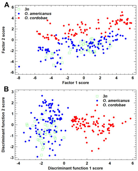 4.1. Prediction 1: Hybridization Due to Natural Mating between the Diploid O. cordobae and Tetraploid O. americanus Is Rare to Absent