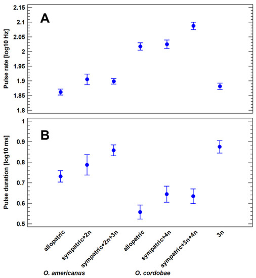 The temperature-adjusted call variables pulse rate and pulse duration were sensitive to the syntopic presence of other taxa (Figure 5). In O. cordobae, syntopy with O. americanus alone or with additionally triploid increased significantly pulse duration compared to allopatric populations (ANCOVA with multiple average comparisons: p < 0.05). Pulse rate increased exclusively in the presence of triploids over the level of allopatric populations (ANCOVA with multiple average comparisons: p < 0.05). In O. americanus, the described response pattern of O. cordobae was reversed. The parameter level of triploids did not differ significantly from those of syntopic O. americanus but did so compared to allopatric populations of the tetraploid (ANCOVA with multiple average comparisons: p < 0.05).