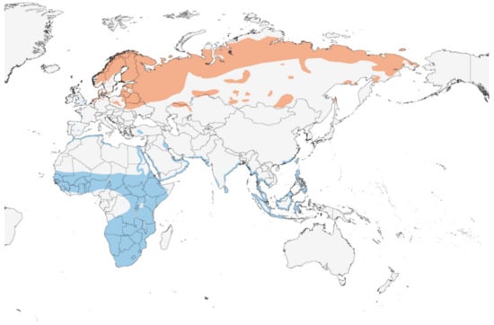 - Schmaltz, L.E.; Loonstra, A.H.J.; Wymenga, E.; Hobson, K.A.; Piersma, T. Quantifying the non-breeding provenance of staging Ruffs, Philomachus pugnax, using stable isotope analysis of different tissues. J. Ornithol. 2018, 159, 191–203. [Google Scholar] [CrossRef]
