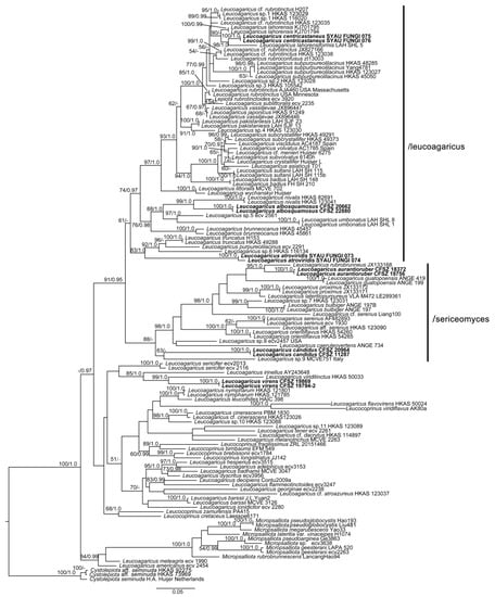Preliminary analysis based on extensive representatives of Leucoagaricus and Leucocoprinus indicated that the putative new taxa are closely related to taxa in section Leucoagaricus and subgenus Sericeomyces. Thus, we built the data matrix by incorporating the newly generated sequences with sequences of taxa belonging to the section Leucoagaricus and subgenus Sericeomyces, as indicated by previous studies [,,,,], along with sequences of representative taxa in other Leucoagaricus sections, as well as sequences from representatives of Leucocoprinus Pat. and Micropsalliota Höhn. Cystolepiota seminuda (Lasch) Bon and Cystolepiota aff. seminuda were designated as outgroup taxa. The sequences were aligned using MAFFT v7.453 [] and inspected and manually corrected using BioEdit v.7.0.9 []. TrimAl v.1.4.rev15 [] was used to remove sites that vaguely aligned. MrModeltest v2.3 [] predicted that GTR+GAMMA+I was the best model for nucleotide substitution under the Akaike information criterion (AIC). The phylogenetic tree was reconstructed using the Maximum likelihood (ML) and Bayesian inference (BI) methods of RAxML 7.2.6 [] and MrBayes 3.2.3 [].