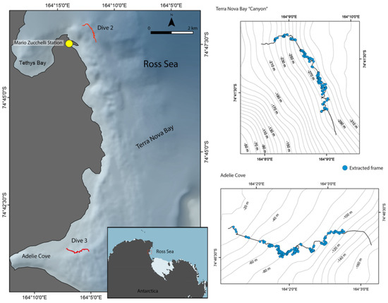 Species distributions at finer spatial scales and their relationship with the surrounding habitat are still poorly known. A recent powerful tool for investigating Antarctic benthic communities is represented by the use of still and video cameras mounted on remotely operated vehicles (ROV) that enable documenting deeper habitats inaccessible to scuba divers. Compared to more conventional methodologies (i.e., benthic trawling), seafloor imagery is a non-destructive and effective survey method providing a fine-scale description of benthic assemblages while minimizing the impacts of direct sampling. The use of underwater photography is particularly advisable in marine protected areas (MPAs), which currently occupy about 12% of the Southern Ocean [14]. The Ross Sea region MPA was established under the Commission for the Conservation of Antarctic Marine Living Resources (CCAMLR) jurisdiction only recently and, encompassing a surface of about 1.55 million km2, represents the world’s largest marine protected area [15].