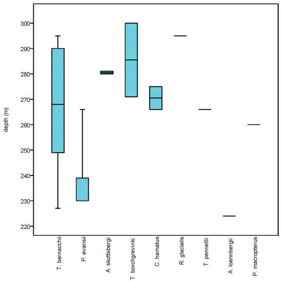 Box plot showing median, 25–75 percentiles, and maximum-minimum depth distribution of species along the transect Adélie Cove.
