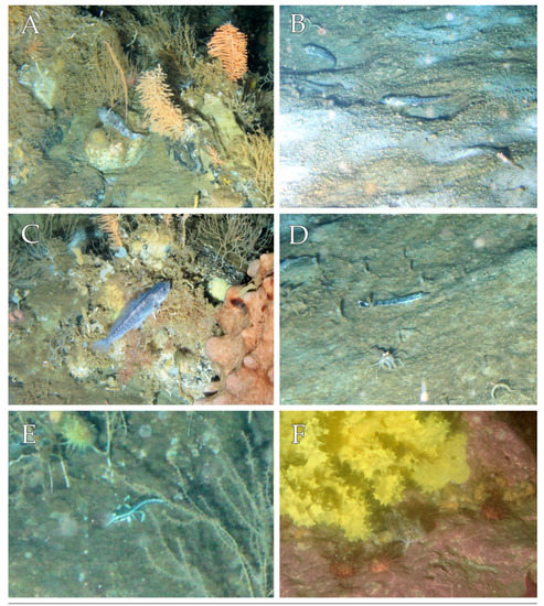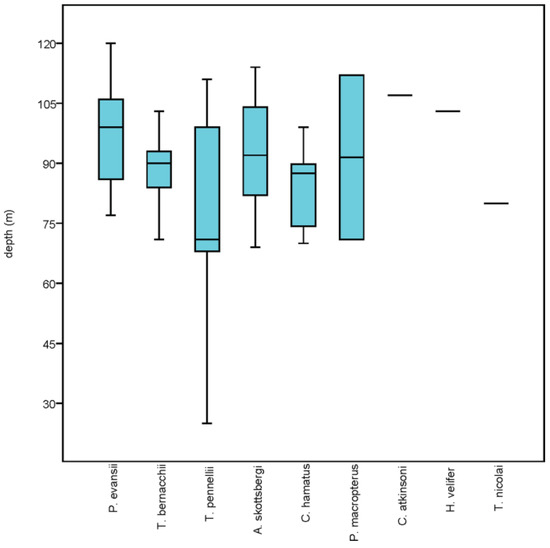 The use of photographic equipment mounted on ROV provided new insights into the depth distribution and behavior of some species, also enabling the documentation of species otherwise difficult to be detected with conventional sampling gears. Nevertheless, species exhibiting negative phototaxis behavior or with benthopelagic habits might be underrepresented in this kind of surveying. Compared with the depth range reported for C. atkinsoni (300–800 m) and H. velifer (210–910 m) [31], the observation of both species at depth of ~100 m in Terra Nova Bay considerably extends their vertical distribution. Similarly, a cryopelagic species like T. borchgrevinki commonly associated with the undersurface of the ice down to 70 m [3,31] was documented swimming above the seafloor at 300 m depth. Yet, the record of a gravid female and a sexually mature male of C. hamatus with high first dorsal fin and flashy knobs on the tip of anal fin rays used in nest building [32] clearly indicates the closeness of the spawning season in this species. As reported by previous authors [33,34] and confirmed here, T. bernacchii and P. macropterus laid and guarded their eggs inside the large cup-shaped sponges or on flat stones, respectively. Finally, underwater photography allowed the documentation of a large number of small-sized fishes such as A. skottsbergi and P. evansii, whose catches using passive gears (i.e., nets) were prevented by their sedentary habits and streamlined body morphology, respectively [11,12]. Most of the species encountered during the ROV survey were associated with a rich benthic invertebrate macrofauna, likely representing a refuge from predators and a proper habitat for fish settling, foraging, and spawning activities. Finally, half of the species showed a wide vertical distribution, having been recorded in both transects.