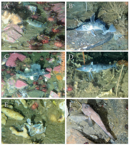 Underwater photographic pictures of the notothenioid fishes recorded during the ROV survey in inshore waters of Terra Nova Bay. (A) Artedidraco skottsbergi; (B) Chionodraco hamatus; (C) Pagetopsis macropterus; (D) Cryodraco atkinsoni; (E) Histiodraco velifer; (F) Trematomus nicolai.