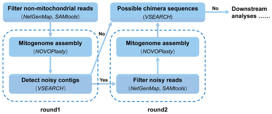 Assembled contig(s) from different NOVOPlasty procedures may be identical for closely related species due to the relaxed seed compatibility. With the species-specific seed sequence (COI here), NOVOPlasty may assemble mitochondrial contigs belonging to other species present in the same sample. This means that the presence of ‘noisy reads’ of non-targeted ‘noisy species’ in the raw sequencing data obstructs the target assembly. The exclusion of these ‘noisy reads’ would alleviate this difficulty. These ‘noisy species’ were identified when the assembled contigs matched the seeds of non-targeted species revealed by VSEARCH results. Noisy reads were filtered against ‘noisy mitochondrial contigs’ assembled in the previous assembly round using NextGenMap, SAMtools with an identity value of 0.99. The resulting reads were used to assemble mitogenomes again for the species that failed in the previous assembly round. Then, the steps of the above noise detection-filtering-assembly procedure were repeated (usually one–two rounds) until no more noisy reads were discovered. Specific mitogenome reference sequences were drawn from Tang et al. [7,34] or NCBI public ones. Due to the great assembly difficulty in dataset DS_B, a second seed of 497-bp ND5 was used for assembly, and species with contigs shorter than 5000 bp were re-assembled in the filtering rounds.
