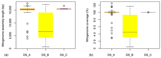 The mitogenome assembly lengths were 14,361.2 ± 3182.7 (3,876–17,633) bp, 8510.2 ± 5241.2 (630–17,211) bp, and 15,582.4 ± 445.5 (15,377–16,673) bp for DS_A, DS_B, and DS_C, respectively, corresponding to the genome coverage (%) relative to the references 95.1 ± 20.1, 58.2 ± 34.2, and 100 ± 0.1 (Figure 2). Ten and seven mitogenomes of DS_A and DS_B, respectively, were slightly longer than the reference. For the dataset DS_B, assembly with ND5 seeds produced contigs (1044–7857 bp) not overlapping with mini-COI results for ten species (Table S2). The mitogenome accuracy for aligned regions was 99.9% ± 0.6%, 99.7% ± 0.4%, 99.6% ± 0.7% for DS_A, DS_B, and DS_C, respectively. Twenty-one mitogenome sequences in DS_A were circularized while 20 were in the reference.