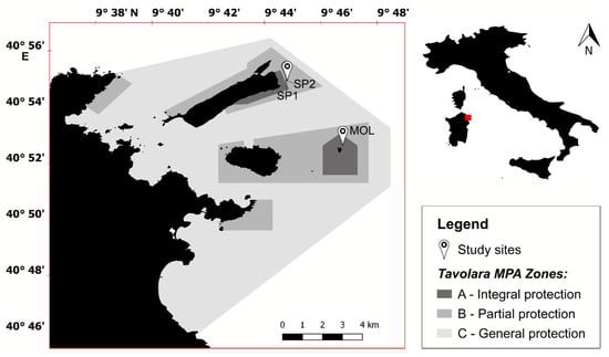 Zonation of Tavolara–Punta Coda Cavallo Marine Protected Area (TPCCMPA). Study sites are indicated: SP1 = Secca Papa 1; SP2 = Secca Papa 2; MOL = Molarotto. Zone A: fully protected (no-take and no-access) zone; Zones B and C: buffer zones where human activities are restricted. In the B zone, only licensed local small-scale fishing and diving are allowed, while in the C zone, regulated fishing is also open to recreational fishing.