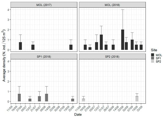 In summer 2017, the mottled grouper was censused only at MOL with an average density of 0.25 ± 0.12 (mean ± SE) individuals per 125 m−2 (transect surface area), while in summer 2018, the recorded grouper average density was 0.63 ± 0.15 at MOL, 0.25 ± 0.12 at SP1 and 0.11 ± 0.06 at SP2 (Figure 2).