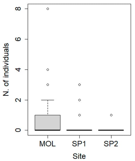 Box-plot of the cumulative abundance of individuals of the mottled grouper censused per study site considering both years (2017 and 2018). Number of replicates (strip transects) per site: 88 at MOL, 64 at SP1 and 52 at SP2. Mottled grouper density was significantly different at MOL compared to the other sites (Kruskal–Wallis chi-squared = 14.41, df = 2, p = 0.0007).