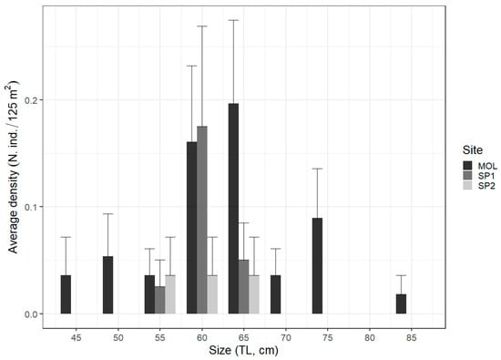 A clear difference in the density and size-frequency distributions of M. rubra was found across the three study sites. Density was greater at MOL than at SP1 and SP2 and this may be due to (i) the topography of the sites, (ii) the higher number of grouper belonging to other sympatric species that may compete for resources [] and (iii) the anthropogenic disturbance, especially due to recreational diver frequentation, which is relatively intense at SP1 and SP2 but absent at MOL. M. rubra occurs over rocky and adjacent sandy bottoms and it is generally more common down to 30 m depth [,,]. Although all study sites are characterised by rocky reefs rising from sandy bottoms, MOL is overall shallower, and slopes are gentler than at SP1 and SP2, thus corroborating previous findings indicating a preference of M. rubra for gently sloping rocky plateaus []. M. rubra depth distribution overlaps with that of E. marginatus [], suggesting they may compete for shared resources (e.g., shelter, food, spawning territories), especially at SP1 and SP2, which were reported as potential spawning aggregation sites of E. marginatus [,]. However, competition between these sympatric species seems unlikely considering that E. marginatus shows a bottom-dwelling behaviour with a preference for shelter-rich rocky reefs (peculiar to SP1 and SP2), while M. rubra exhibits more pelagic habits with a preference for less uneven, rocky substrates (distinctive of MOL) [,]. Moreover, no evidence is available concerning competition for food resources [].