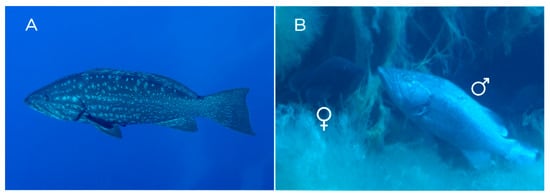 M. rubra is a sub-tropical grouper native to the Mediterranean Sea and, being thermophilic, it is more common in the southern than in the northern Mediterranean [,,,]. However, due to ocean warming, it is expanding its range northward with new records in the northwestern Mediterranean made over the past two decades [,,,]. Like most groupers [], the mottled grouper is a protogynous hermaphrodite, changing sex from female to male []. Females are reported to attain sexual maturity around 35 cm TL and change sex around 40–65 cm TL [,].