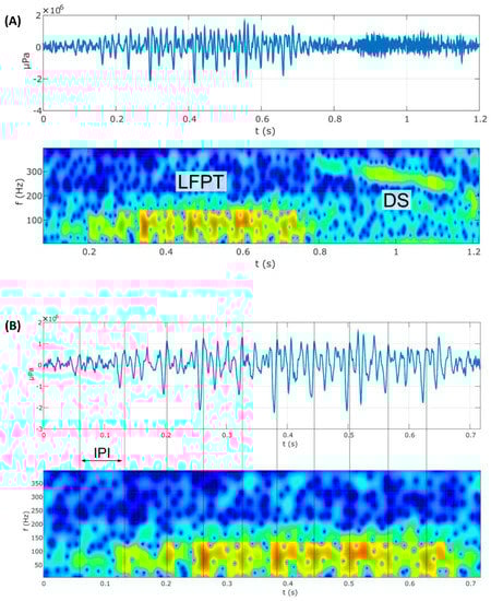 Two sound types, mostly recorded in pairs, were only found in the recordings made at the fully protected site of MOL. The recorded signals have never been reported to date [,,] and were likely emitted by a grouper species as they share typical acoustic features, such as low-frequency pulse series often combined with a downsweeping sound [,,,,,,]. In the TPCCMPA, other grouper species and documented soniferous fish species have been censused (Supplementary Materials Table S2; [,,]). However, the dusky grouper was the only other grouper species recorded at MOL concomitantly with the present study [] and its calls as well as the ones emitted by other known vocal fish occurring in TPCCMPA are distinct from the sounds described here [,,,,,,]. The presumed mottled grouper calls were referred to as a low-frequency fast pulse train (LFPT; Table 3, Figure 6) often combined with a downsweeping sound (DS; Table 3, Figure 6). On average, LFPT sounds had a duration of 477 ± 122.5 ms (mean ± SD) and were composed of 9.1 ± 2.7 pulses (19 ± 2.8 pulses s−1), with an IPI of 59.1 ± 12.5 ms and a peak frequency of 82.2 ± 35.7 Hz (Table 3). DS sounds lasted 337.1 ± 164.2 ms on average and had a mean peak frequency of 216.6 ± 70.3 Hz (Table 3).