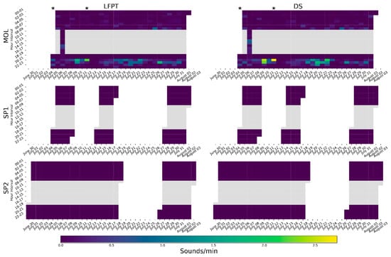 Weighted sound abundances (number of sounds by sound type (left: LFPT; right: DS) per effective minute of recording within an hour interval) recorded across the three sites throughout the month of July 2017 (hours refer to CEST). The asterisks (*) indicate the dates when presumptive courtship displays and also an aggregation (12 July) were observed. The white areas indicate absence of acoustic data, while grey areas indicate that recordings were not analysed. On 7 July, the recordings for the whole day (24 h) were analysed.