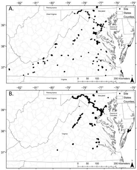 - Silvis, A.; Kniowski, A.B.; Ford, W.M. Distribution of Indiana Bats (Myotis sodalis) and Northern Long-Eared Bats (M. Septentrionalis) in Virginia; Virginia Field Office: Glouchester, VA, USA, 2017; p. 61. [Google Scholar]