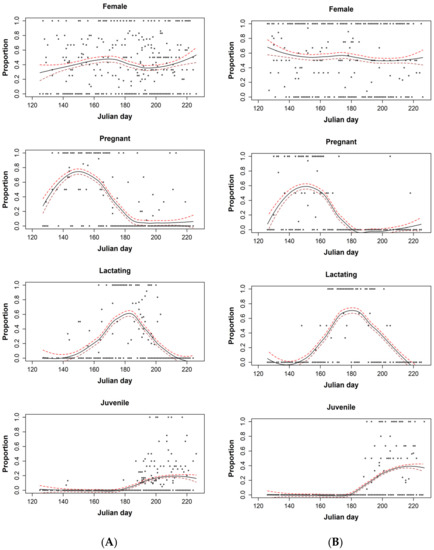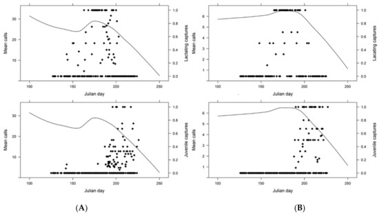 Similar to Francl et al. [28], we used Program R to calculate a locally estimated scatterplot smoothing (LOESS) line for the proportion of pregnant, lactating, and juvenile big brown and eastern red bats captured each Julian day [34]. We calculated the mean number of echolocation calls per Julian day for big brown and eastern red bats, and calculated the LOESS curve for both datasets. To determine peak maternity season activity, we identified the inflection point, or the Julian day, where the trend curve reached the highest asymptote, for each regression line. We used Julian day for our calculations, but report findings as calendar day in text.