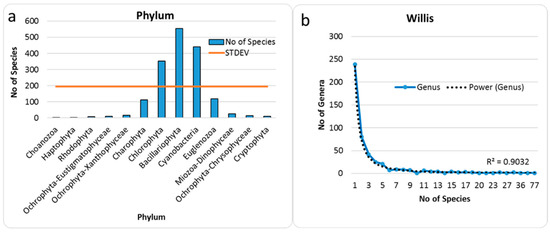 Distribution of species richness of algae and cyanobacteria of Israel over taxonomic phyla with STDEV as standard deviation line (a), and in the Willis curve as number of genera over species number (b).