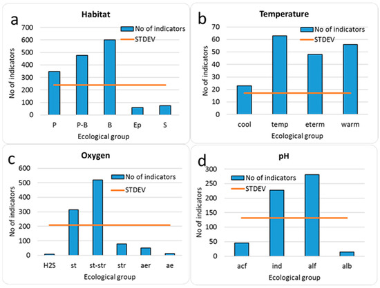 Distribution of species-indicator in groups of preferences of habitat: (P—planktonic, P-B—plankto-benthic, B—benthic, Ep—epiphyte, S—soil) (a). Temperature: (cool—cool water, temp—temperate, eterm—eurythermic, warm—warm water) (b). Oxygen: (H2S—sulfides resistant; st—standing water, str—streaming water, st-str—low streaming water, aer—aerophiles; ae—aerophites) (c). Water pH: (alb—alkalibiontes; alf—alkaliphiles, ind—indifferent; acf—acidophiles; neu—neutrophiles as a part of pH-indifferent taxa) (d). STDEV: standard deviation line. Abbreviation also as in Table 3.