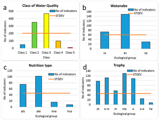 Distribution of species-indicator in groups of preferences of water quality class in the EU FWD color ranges (a). Organic pollution according to Watanabe (sx—saproxenes; es—eurysaprobes; sp—saprophiles) (b). Nutrition type as nitrogen uptake metabolism (ats—nitrogen-autotrophic taxa, tolerating very small concentrations of organically bound nitrogen; ate—nitrogen-autotrophic taxa, tolerating elevated concentrations of organically bound nitrogen; hne—facultative nitrogen-heterotrophic taxa, needing periodically elevated concentrations of organically bound nitrogen; hce—obligate nitrogen-heterotrophic taxa, needing continuously elevated concentrations of organically bound nitrogen) (c). Trophic state (ot—oligotraphentic; o-m—oligomesotraphentic; m—mesotraphentic; me—mesoeutraphentic; e—eutraphentic; he—hypereutraphentic; o-e—oligo- to eutraphentic (hypereutraphentic)) (d). STDEV: standard deviation line. Abbreviation also as in Table 3.