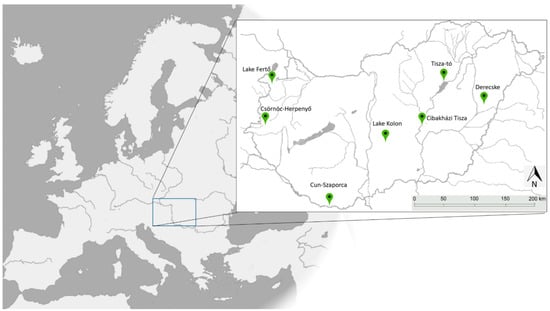 Tench (Tinca tinca L. 1758) is a native freshwater cyprinid fishin Europe and Asia [], including Hungary’s Danube catchment region. The species thrives in lentic habitats such as shallow, densely vegetated lakes and backwaters. It can live in highly varying environments, and as a eurythermal species, it can adapt to a wide range of temperatures up to 37 °C and to extremely low oxygen levels. This hypoxic tolerance makes them able to outcompete native species that are sensitive to oxygen deficiency and are unable to survive in such habitats outside the native range of tench. During the winter, it is often buried in mud to await warmer weather []. These characteristics make it an ideal candidate for adaptability to a wide range of environmental conditions. Despite a long history of being regarded as a neglected pond fish species [], the tench now has considerable aquaculture potential [,] and interest in its rearing has recently grown significantly [,,,,,]. Due to its flavour and high interest among sport anglers, tench production has expanded in Europe [,]. In some parts of the continent special breeds of the species, such as Tinca Gobba Dorata del Pianalto di Poirino, presents a special quality and value []. However, in other parts of Europe it has been reared almost as a supplementary fish in polyculture ponds for many years, alongside other cyprinid species, mainly for the purpose of increasing yield. Traditionally, tench is co-cultured with the common carp (Cyprinus carpio Linnaeus, 1758) [,,]. Nowadays, this species is extensively domesticated, similar to how common carp was centuries ago [] and studies were carried out focusing on solving the problems connected to intensive rearing of the species [,]. Thus, it is important to estimate genetic variation in its populations to promote tench production and genetic improvement, which is required for successful selective breeding.