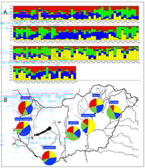 Clustering the 175 individuals by STRUCTURE software (Figure 2) resulted in the most probable number of K = 4 clusters. The mean log likelihood data and Evanno’s delta K of the hierarchical STRUCTURE analysis are shown in Table S5. Contrary to expectations, none of the four clusters were closely related to localizations within or between watersheds; only their proportions were different. The first cluster (red colour) is frequent in the North-Western region (Lake Fertő); the second (green colour) in the Central-Eastern region (Lake Kolon and Derecske); the third cluster (blue colour) in the Central and South-Western region (Csörnöc-Herpenyő, Cun-Szaporca) and the fourth (yellow colour) in the Eastern region (Cibakházi Tisza). Tisza-tó population was a mixed population with equal frequency for all clusters.