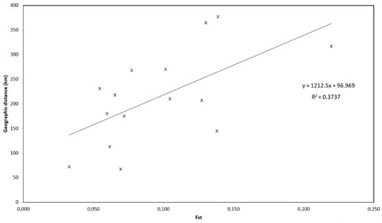 The regional genetic separation of the populations was moderate. Considering all the seven populations the Mantel test resulted in non-significant association between the geographical distance (GeoD) and the Fst (GeoD = 617.8 × Fst + 158.93, R2 = 0.0983, p = 0.105). However, if the mixed Lake Tisza population was excluded, the association (GeoD = 1212.5 × Fst + 96.969, R2 = 0.3737; Figure 3) became significant (p = 0.032).