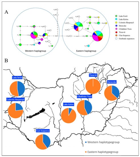 Based on the haplotype network, a total of 98 individuals (67.1%) were classified in the Eastern haplogroup and 48 individuals (32.9%) in the Western haplogroup (Table 5). Among the populations, the Tisza Lake population contained only individuals belonging to the Eastern haplogroup, while in the other populations individuals from both haplogroups were found in different proportions. The populations of Kolon Lake, Csörnöc Herpenyő and Derecske contained a higher proportion of Eastern haplotypes, while in the other populations the haplogroups were largely equally present.