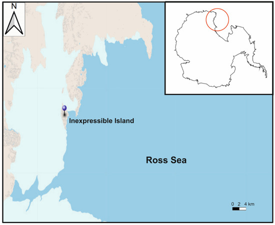 Map of Inexpressible Island, the sampling site is defined by the blue pin. The red circle indicates the location of Terra Nova Bay.