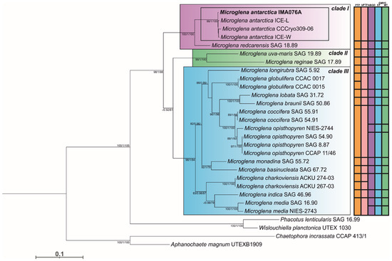 The tree constrained to monophyly M. redcarensis SAG 18.89 with Microglena reginae SAG 17.89 and M. uva-maris SAG 19.89 (clade II) was significantly worse than the best unconstrained tree (Figure 2), as was the tree constrained the monophyly of M. antarctica (IMA076A, CCCryo 309-06, ICE-L and ICE-W) and M. redcarensis SAG 18.89 (clade I) with freshwater species (clade III). A tree constrained to the marine strains (M. antarctica IMA076A, CCCryo 309-06, ICE-L and ICE-W, M. redcarensis SAG 18.89, Microglena reginae SAG 17.89 and M. uva-maris SAG 19.89) to monophyly was not significantly different from the best unconstrained tree found (Table 1).