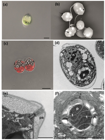 - Sugasawa, M.; Matsuzaki, R.; Arakaki, Y.; Nozaki, H. Morphology and phylogenetic position of a rare four-celled green alga, Pascherina tetras (Volvocales, Chlorophyceae), based on cultured material. Phycologia 2015, 54, 342–348. [Google Scholar] [CrossRef]